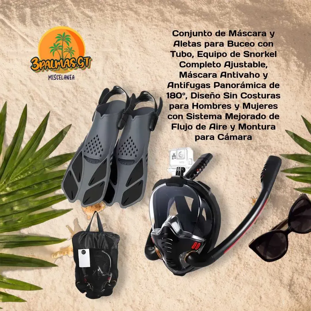 Conjunto de Máscara y Aletas para Buceo con Tubo, Equipo de Snorkel Completo Ajustable, Máscara Antivaho y Antifugas Panorámica de 180°, Diseño Sin Costuras para Hombres y Mujeres con Sistema Mejorado de Flujo de Aire y Montura para Cámara