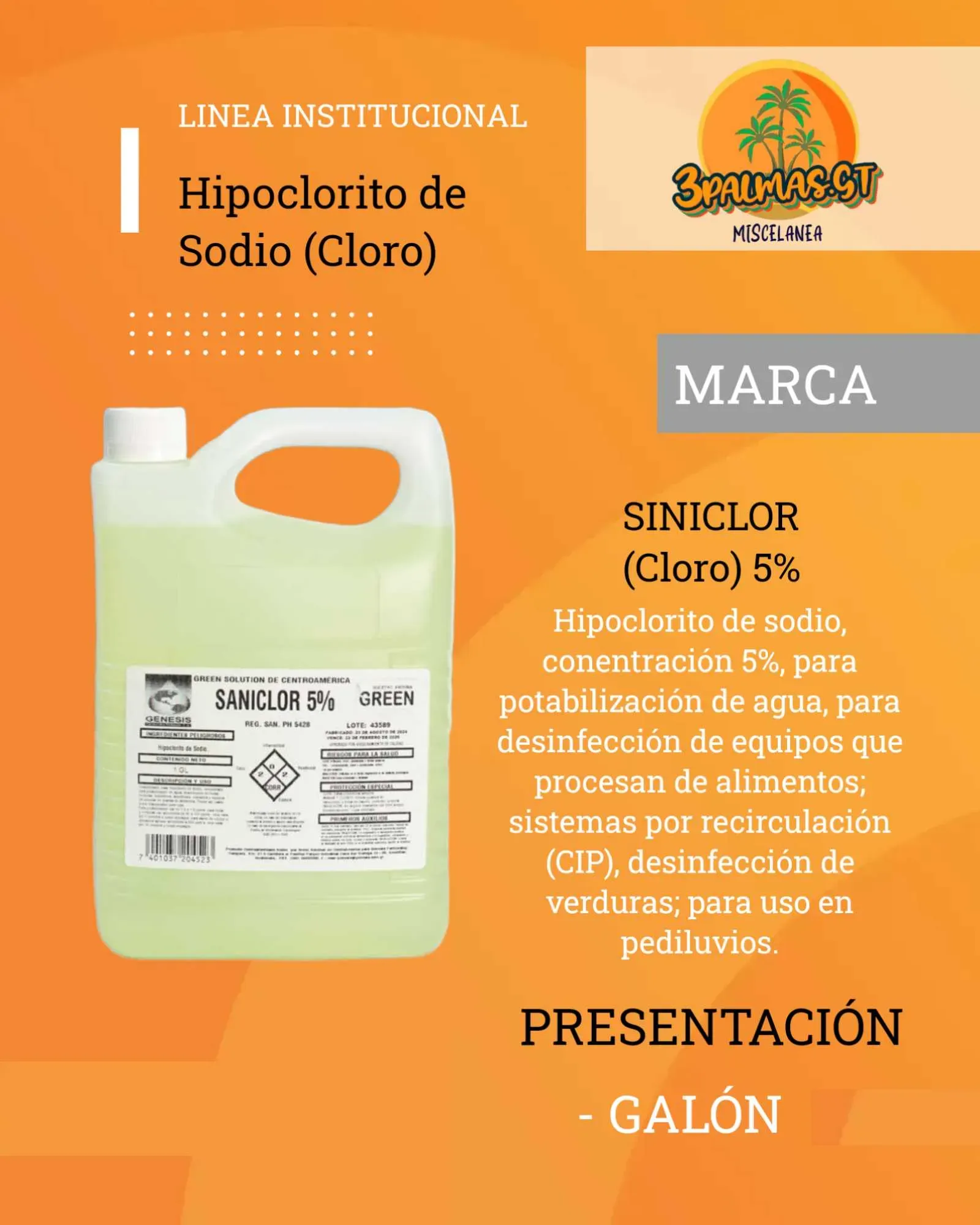 Hipoclorito de sodio, conentración 5%, para potabilización de agua, para desinfección de equipos que procesan de alimentos; sistemas por recirculación (CIP), desinfección de verduras; para uso en pediluvios.